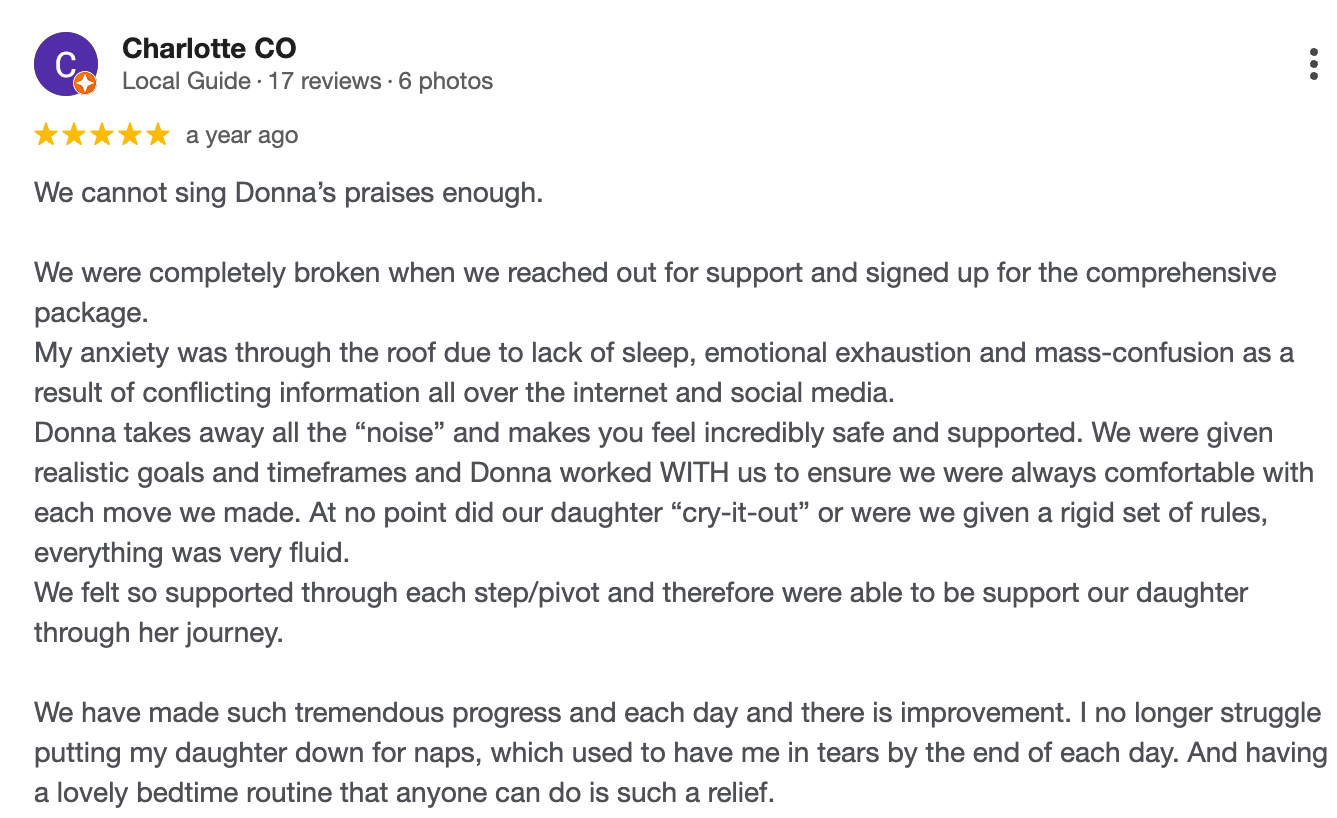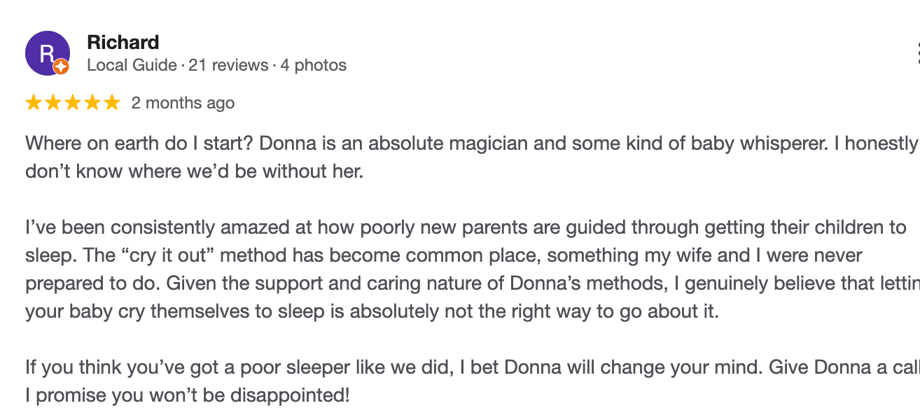 Suitable for newborns through to 10-year-olds, this 21-day support package includes unlimited access to Donna, daily sleep log reviews, phone consults, and real-time guidance to help you create calm nights and confident routines.