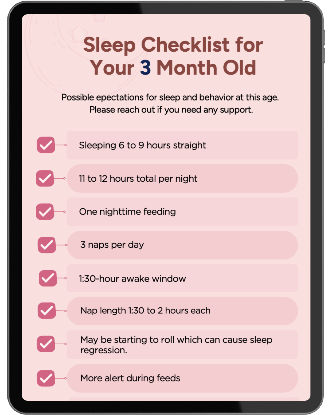 This Sleep Checklist Guide gives you clear, age-appropriate expectations for your little one’s sleep from 3 months through the toddler years. With simple checklists for naps, awake windows, night sleep and common developmental regressions, this guide removes the guesswork and helps you understand what’s normal at each stage. Designed to support calmer days and more predictable nights, it’s the perfect companion for parents wanting clarity, confidence and a more settled sleep rhythm.